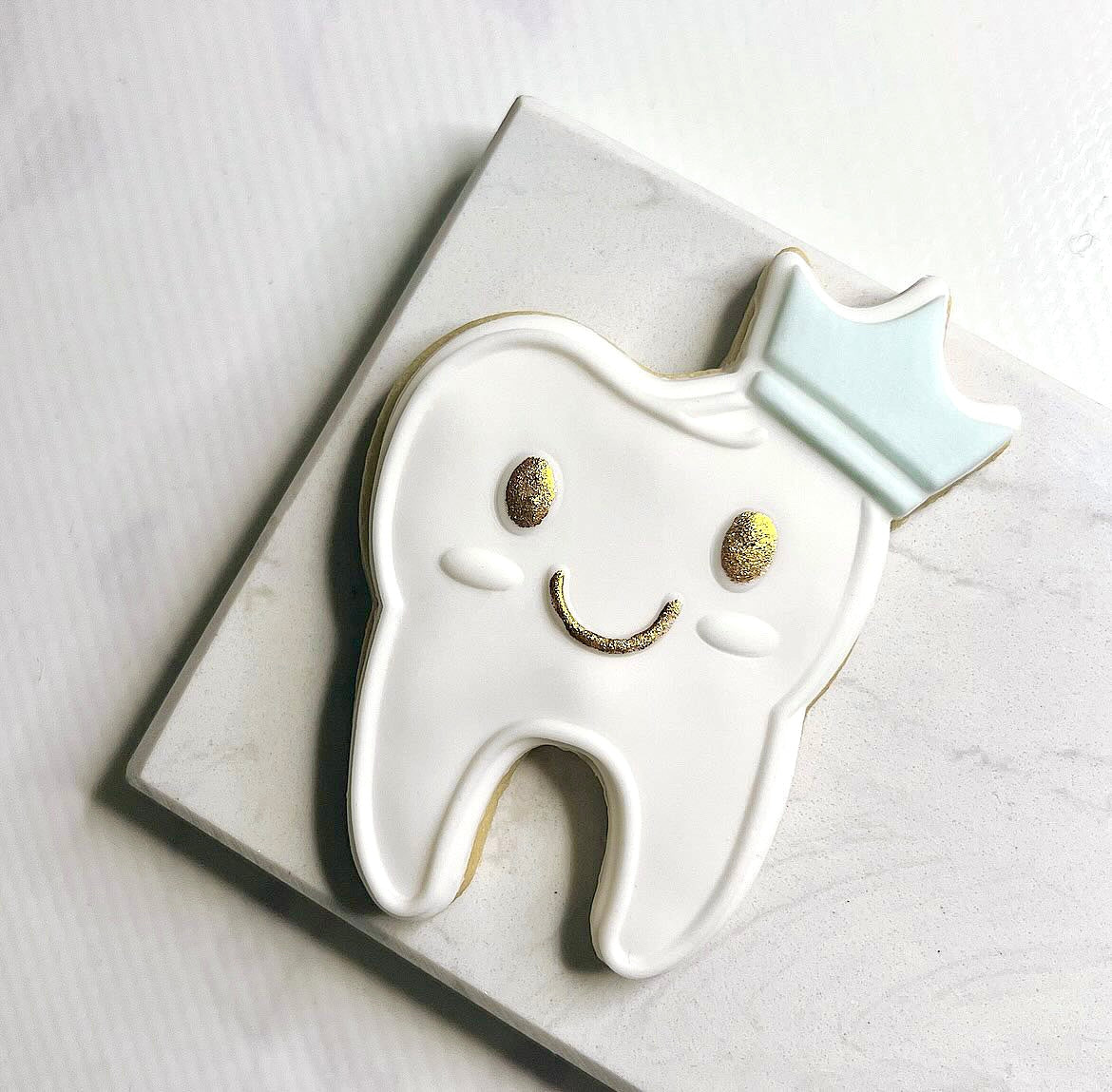 Emporte-pièce et tampon d'une dent ornée d'une couronne.