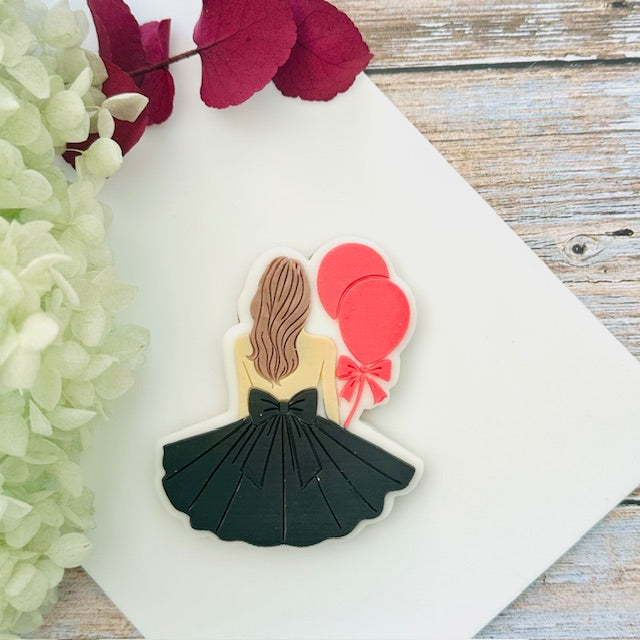 Emporte-pièce et tampon d'une fille de dos tenant des ballons.