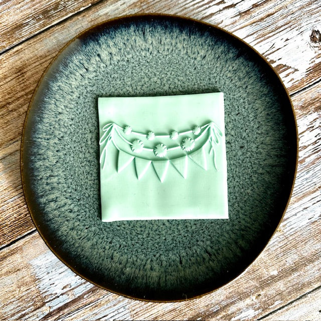 Emporte-pièce et tampon de trois guirlandes ornée de pompons.
