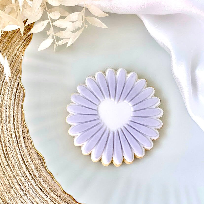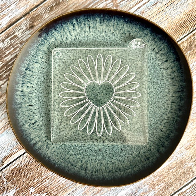 Emporte-pièce et tampon d'une marguerite avec un coeur vide au centre.