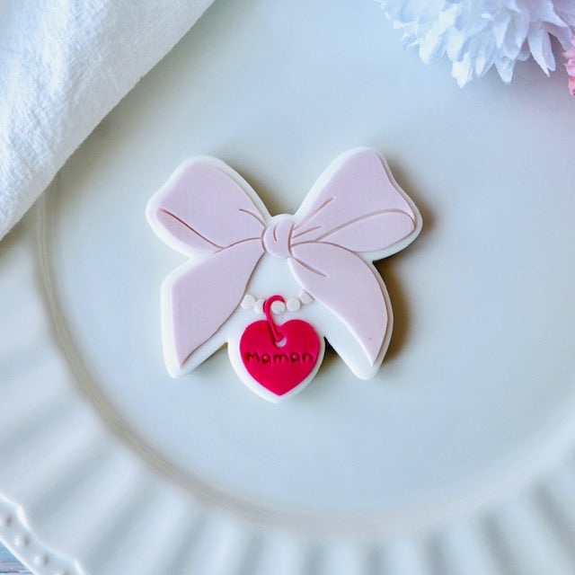 Emporte-pièce et tampon d'une médaille en forme de coeur ornée d'un gros noeud.