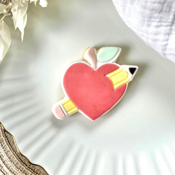 Emporte-pièce et tampon d'une pomme en forme de coeur transpercée par un crayon.