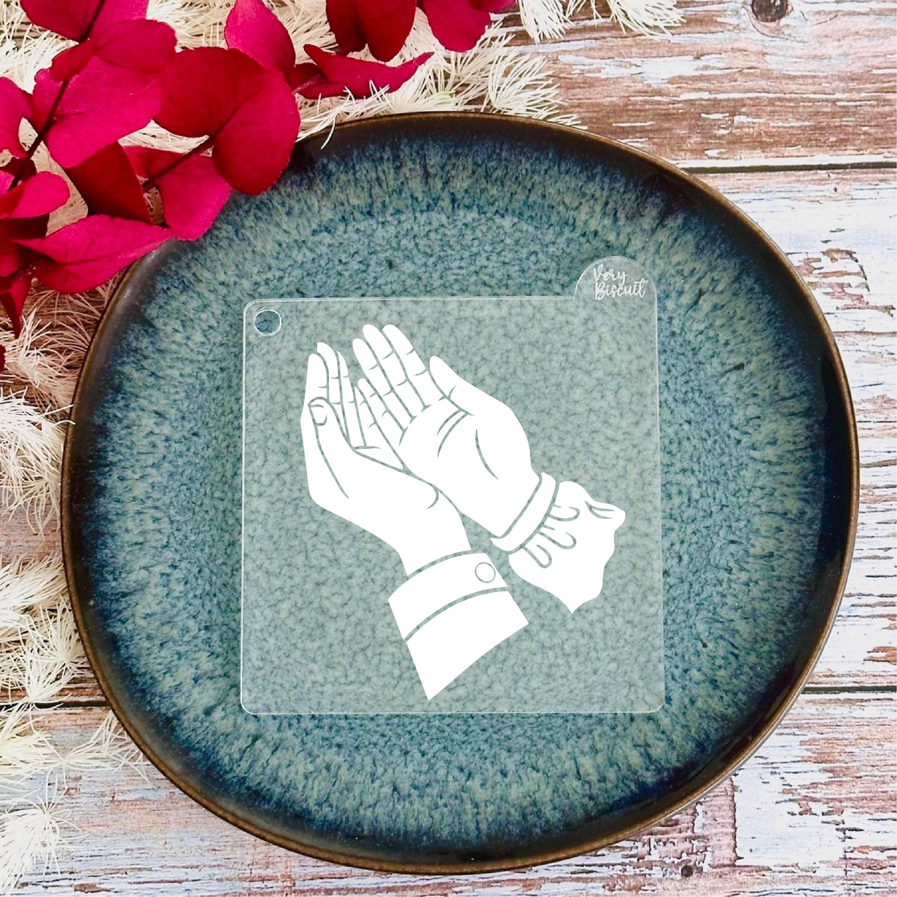 Emporte-pièce et tampon de deux mains priant, une d'une femme et une d'un homme.