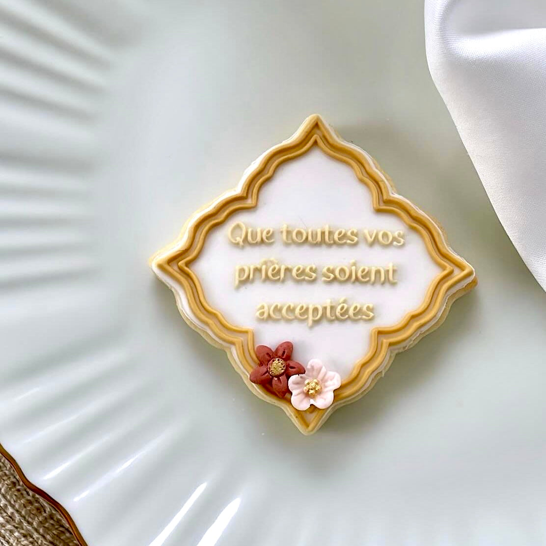 Collection Eid : Emporte-pièce et tampon d'un motif oriental dans lequel se trouve le texte "que toutes vos prières soient exaucées".