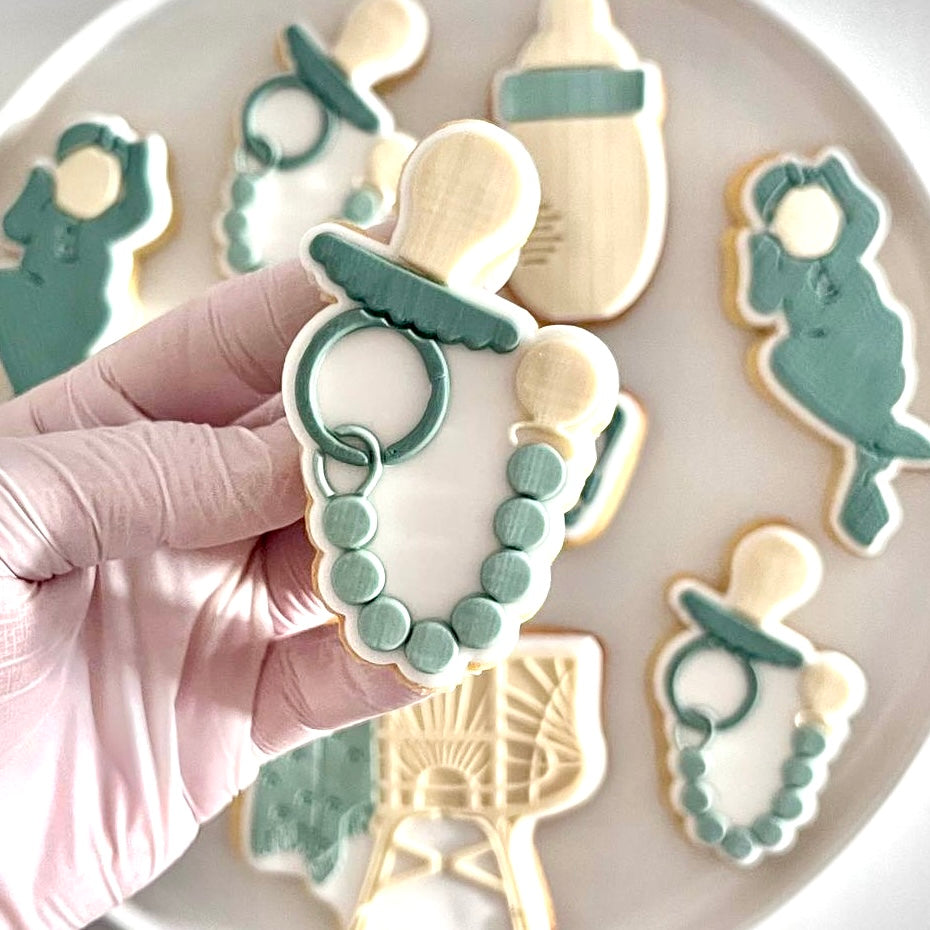 Emporte-pièce et tampon d'une tétine et son accroche.